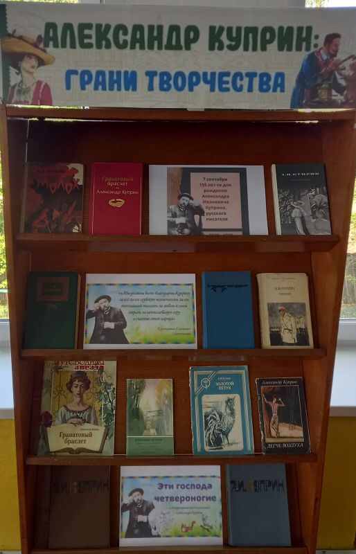 Сотрудники Районной детской библиотеки оформили книжно-иллюстративную выставку «Александр Куприн: грани творчества». Посетив выставку, читатели познакомятся с творчеством писателя. Среди представленных на выставке книг повести «Олеся», «Поединок», «Гранатовый браслет» и др. Приглашаем всех желающих с 1 по 30 сентября посетить книжную выставку и окунуться в необычный мир героев А.И. Куприна, влиться в «поток жизни», в который впадает и река сегодняшнего дня.